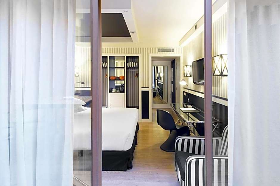 Sesongåpent takbasseng kun for voksne, med grunt parti og vidstrakt byutsikt, tilbyr et luftig høyhusretreat over Barcelonas gater — perfekt for en solfylt pause eller et øyeblikk i solnedgangen.